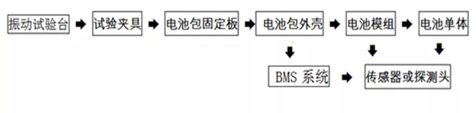 電池的振動(dòng)試驗(yàn)涉及到振動(dòng)能量的傳播,這涉及到能量的傳播方向或路徑,試驗(yàn)樣品安裝應(yīng)符合GB/T2423.43的要求,如果樣品安裝方式不當(dāng),往往會(huì)改變振動(dòng)能量的真實(shí)傳播,最終影響到試驗(yàn)結(jié)果。電池振動(dòng)試驗(yàn)的能量傳播方向和路徑見(jiàn)圖2:振動(dòng)能量傳播示意圖。
